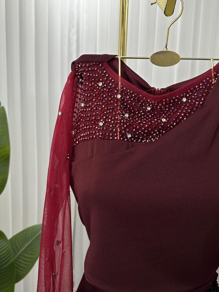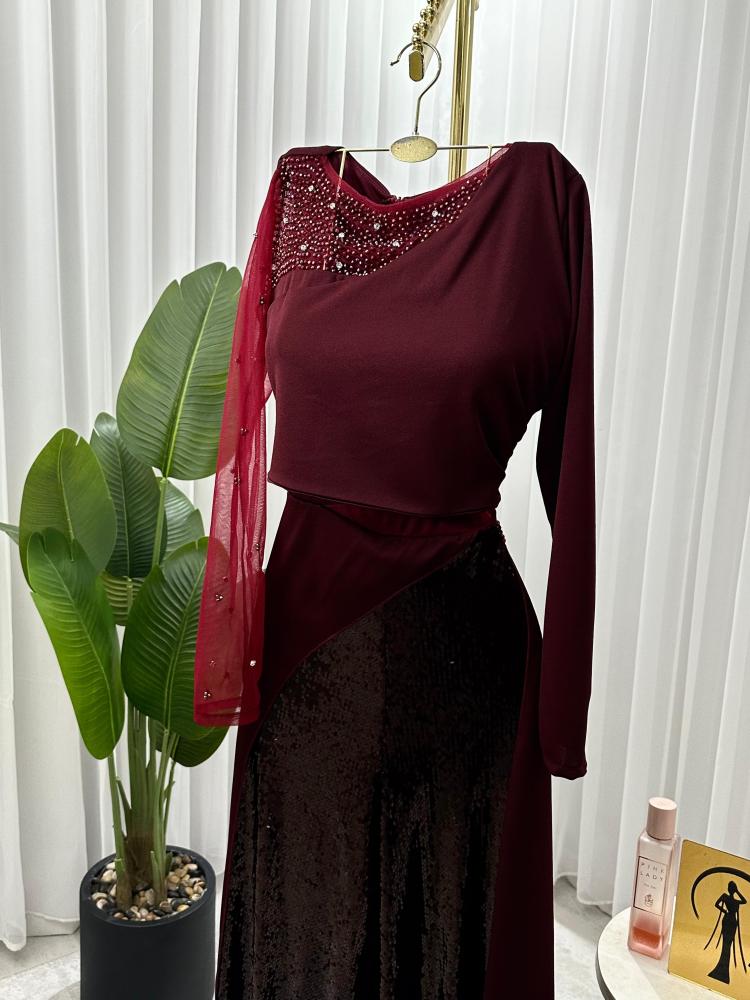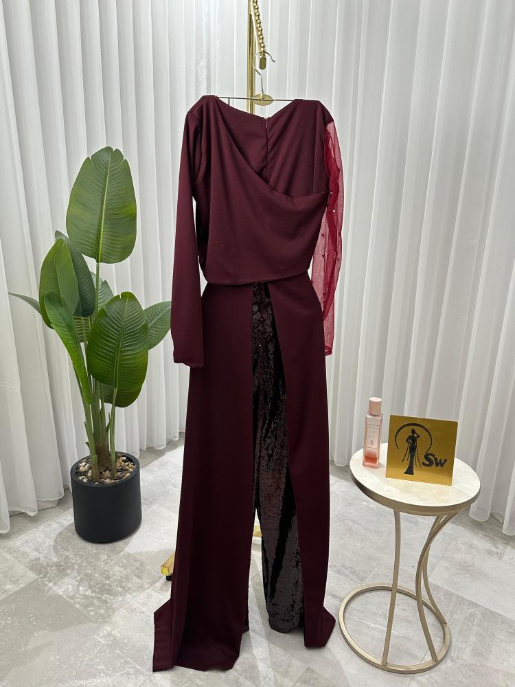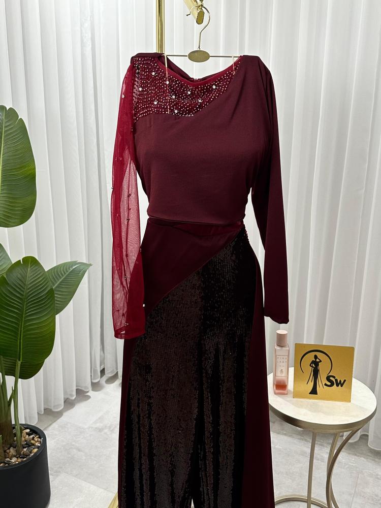 تألقي بإطلالة ساحرة مع لبس جمسوت برغندي يجمع بين الفخامة والعصرية بتصميم أنيق ومميز يناسب السهرات والمناسبات الخاصة. مصنوع من خامة كريب فاخرة مع تفاصيل ترتر براقة تمنحك لمسة من التألق والجاذبية في كل خطوة.