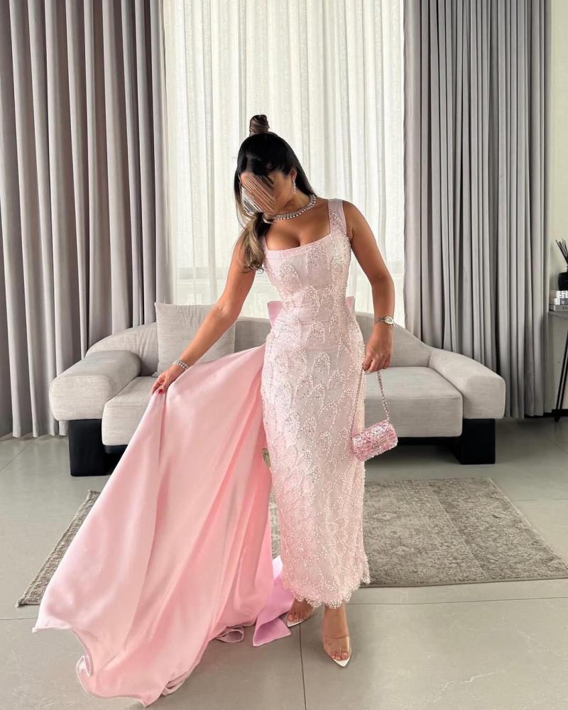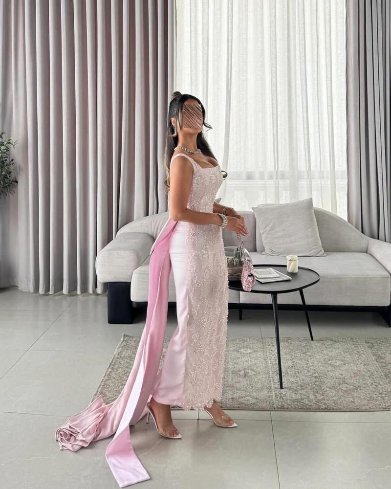 146.63 USDفستان سهرة أنيق باللون الوردي الفاتح، مصنوع من خامة مطرزة بالكامل بالخرز واللؤلؤ الناعم، مع قصة ضيقة تُبرز القوام وأنوثة الإطلالة. يتميز بربطة خلفية طويلة تضيف لمسة فاخرة، وتصميم بدون أكمام يناسب المناسبات الفاخرة والخطوبات.